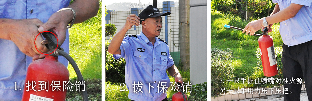 使用灭火器前,先把灭火器上下颠倒几次,使筒内干粉松动,然后找到灭火器上的保险销,并拔下保险销,之后一手握住喷嘴对准火源,另一只手用力按压下压把。